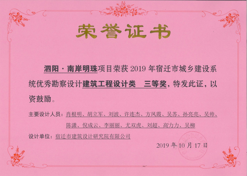 1、泗陽(yáng) 南岸明珠 榮獲建筑工程設(shè)計(jì)類 三等獎(jiǎng)